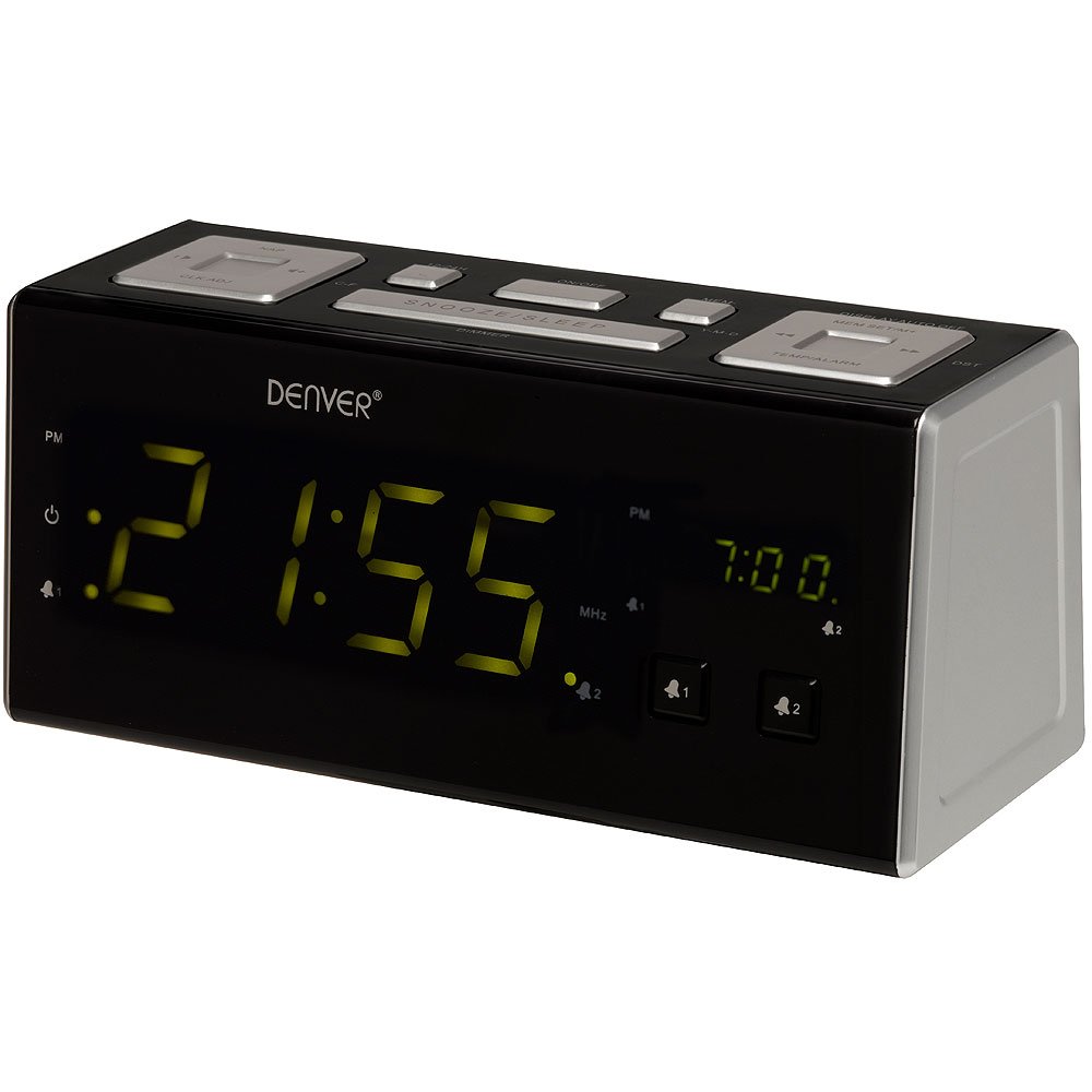 The Denver CR-415 is a dual alarm clock radio with indoor temperature indicator, Snooze & Sleep functions, wake to FM radio or buzzer, large easy to see 1.2 inch LED display, no weekend alarm mode, battery backup and large easy to use buttons … making this the perfect all rounder radio clock alarm for next to your bed.