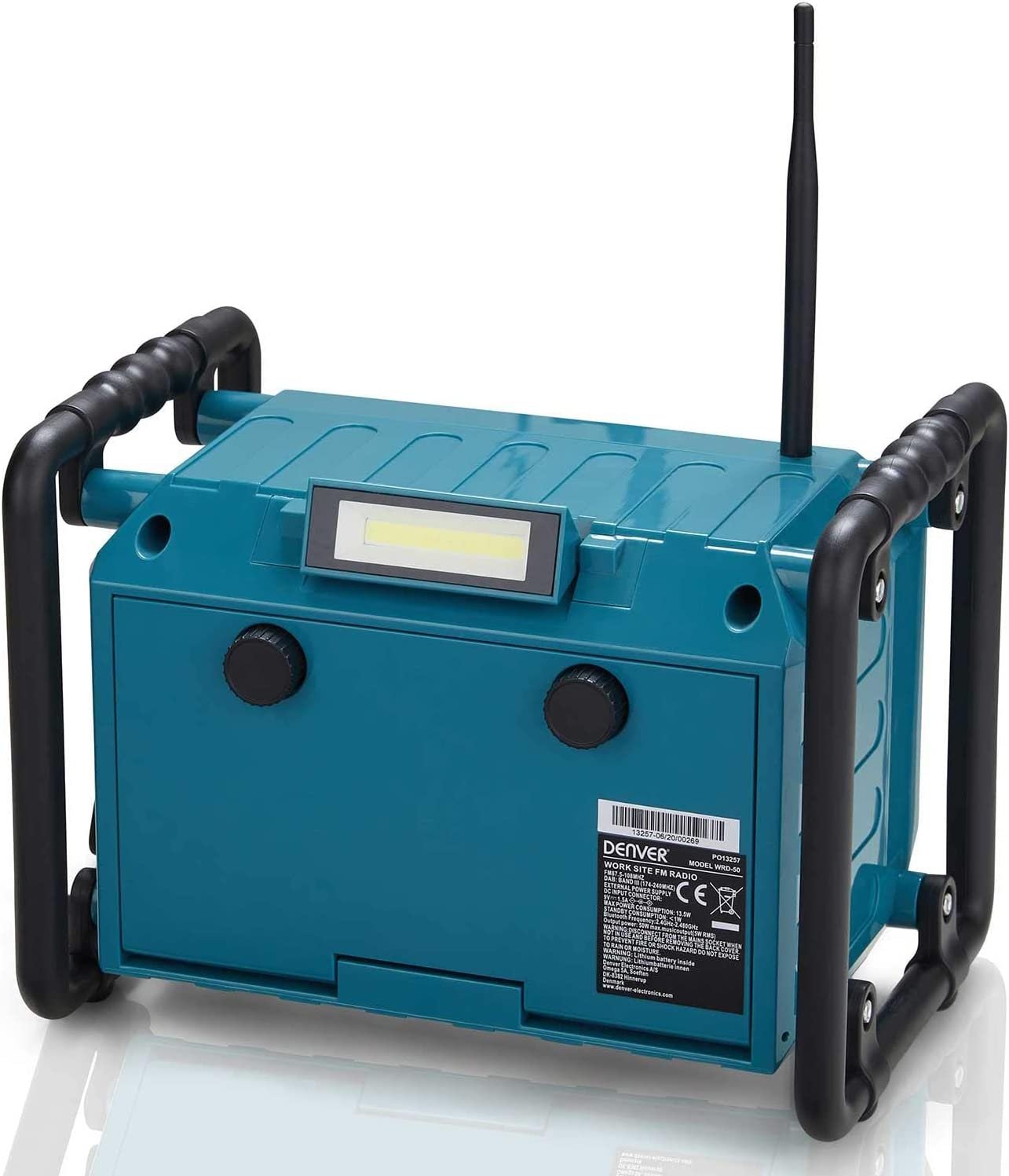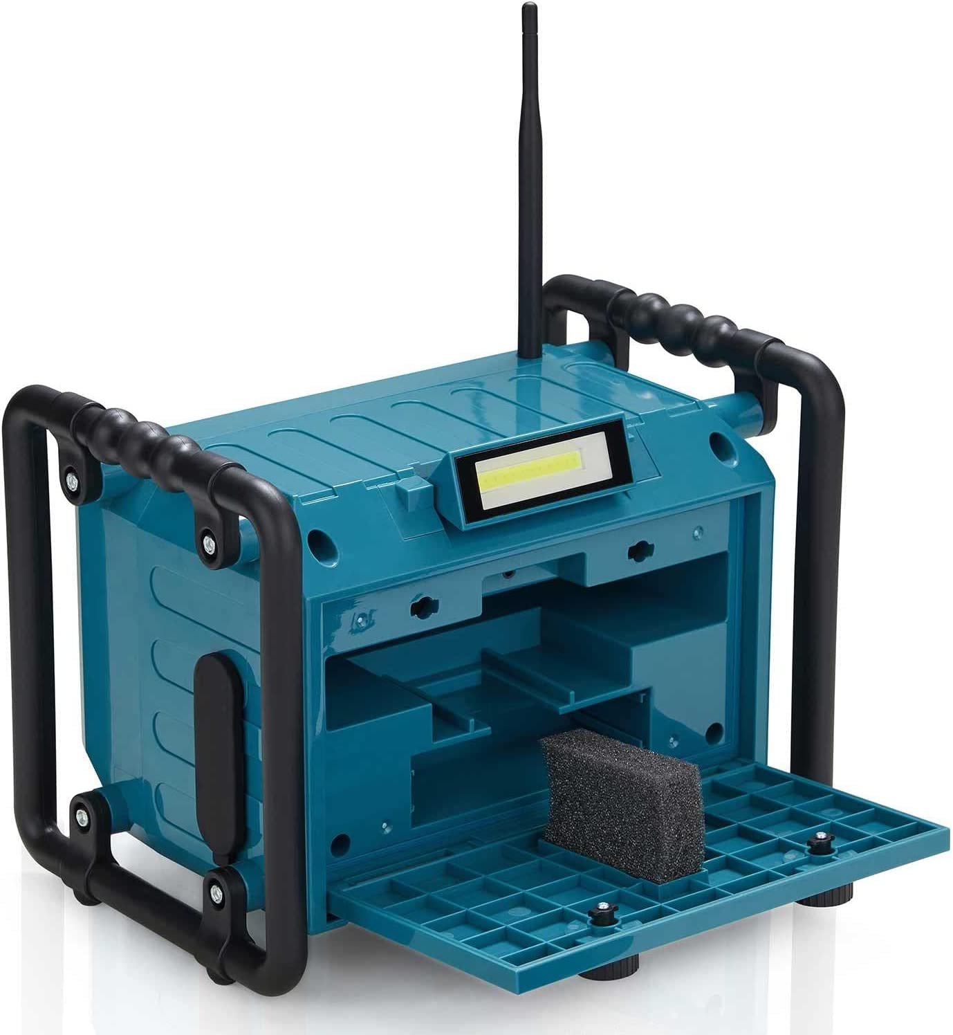 Splash proof means rain wont affect it and the incredibly handy floodlight located on the top / rear of this jobsite radio makes visibility in darker work environments easier.